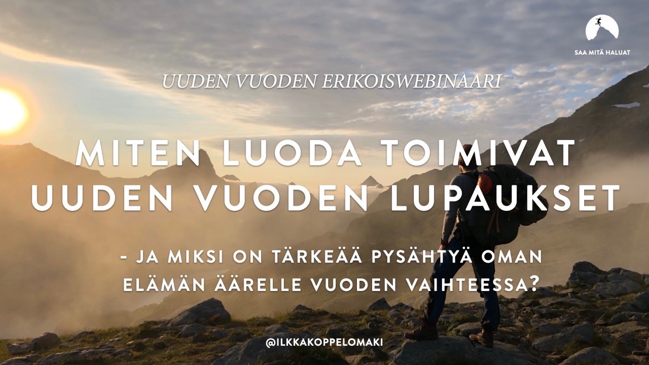Tässä Ilkka Koppelomäen uuden vuoden erikoiswebinaarissa opit miten luoda toimivat uuden vuoden lupaukset ja miksi on tärkeää pysähtyä oman elämän äärelle vuoden vaihteessa. Luvassa konkreettinen ja inspiroiva 1,5 tuntia! Ilmoittaudu mukaan nyt!