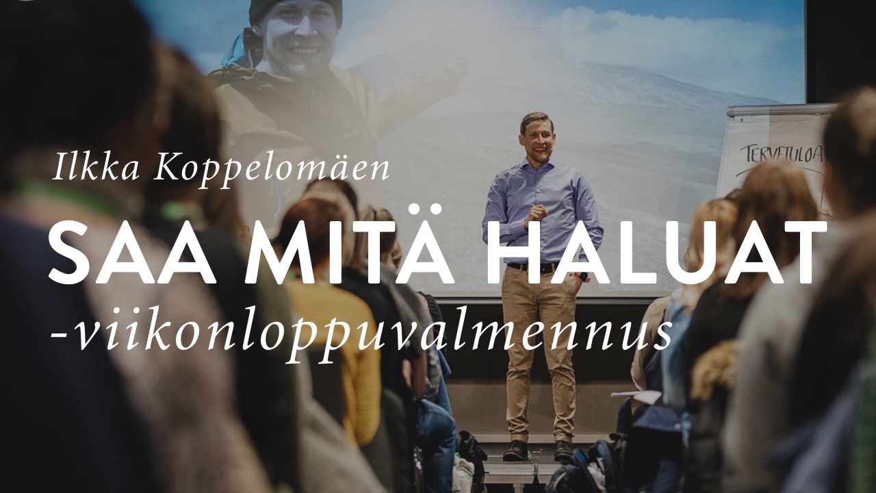 Saa mitä haluat on 2-päiväinen konkreettinen valmennusviikonloppu, jonka aikana saat selkeyttä ja rohkeutta omien tavoitteidesi toteuttamiseen tekemällä Saa mitä haluat -prosessin yhdessä menetelmän kehittäjän Ilkka Koppelomäen kanssa.